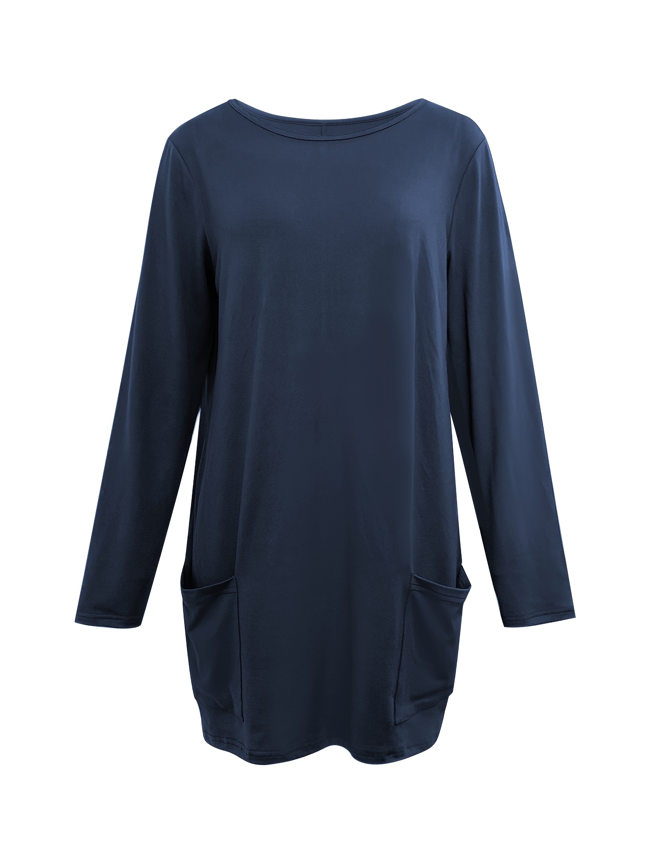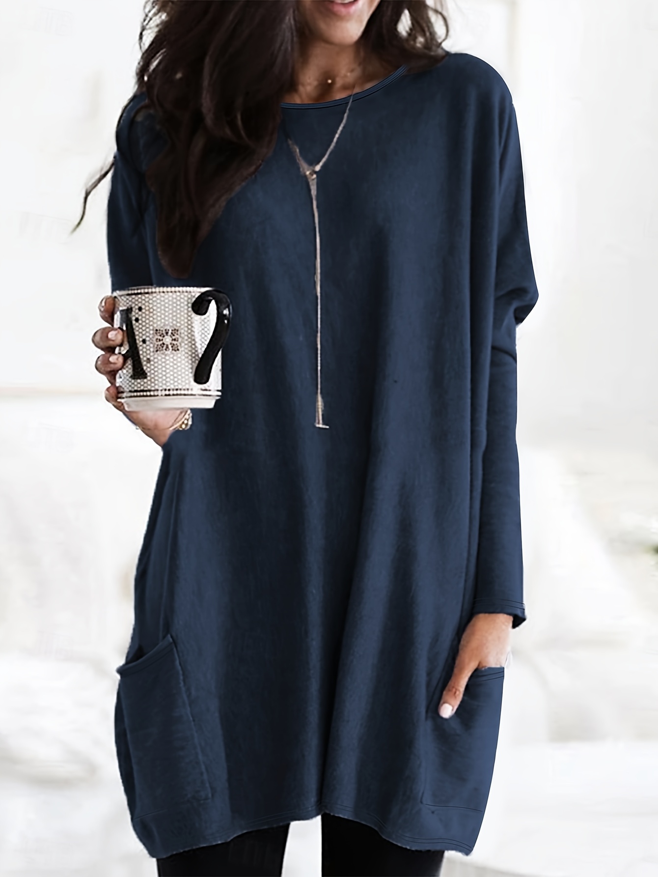 [Long Sleeve Tunic Top] Women's Long Sleeve Tunic Top - Relaxed Fit, Side Pockets, Easy-Care, Breathable Material, Versatile Shirt for Office, Errands, Outings, Casual Everyday Blouse, Minimalist Style, Simple Elegant Design, Comfortable Wear
