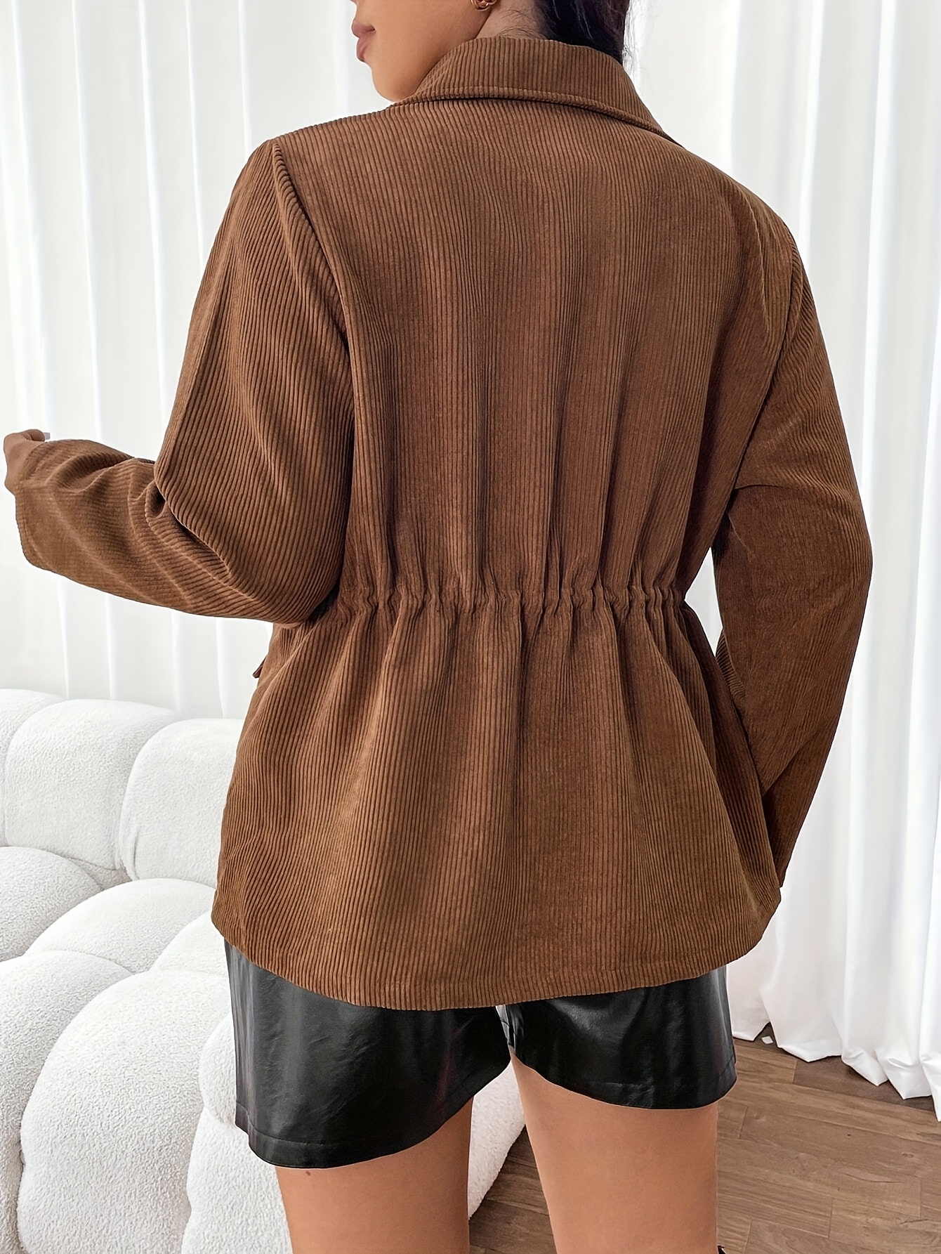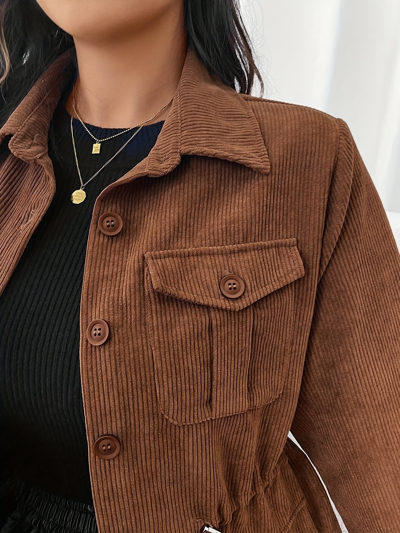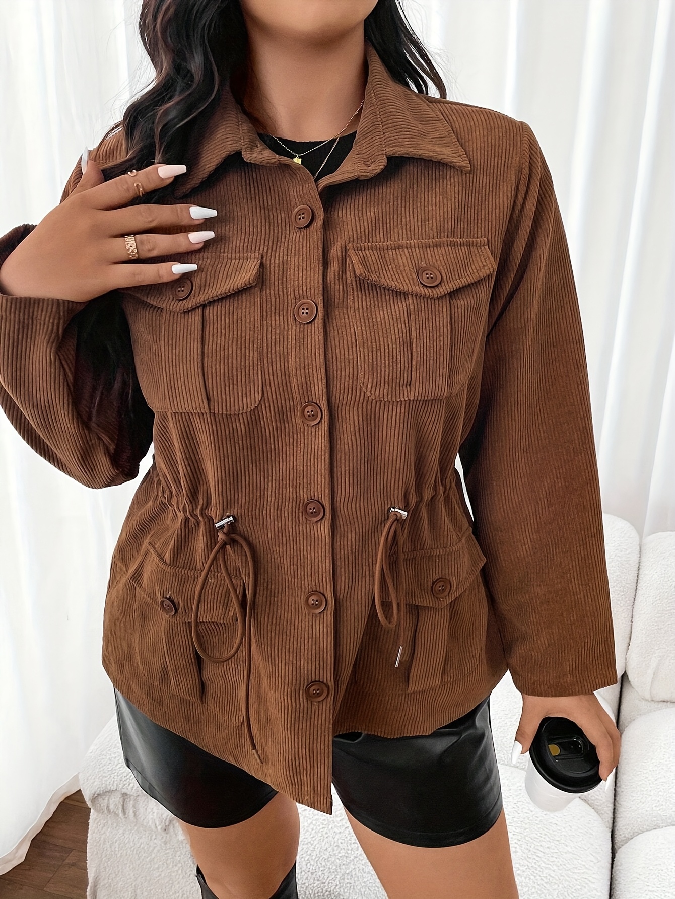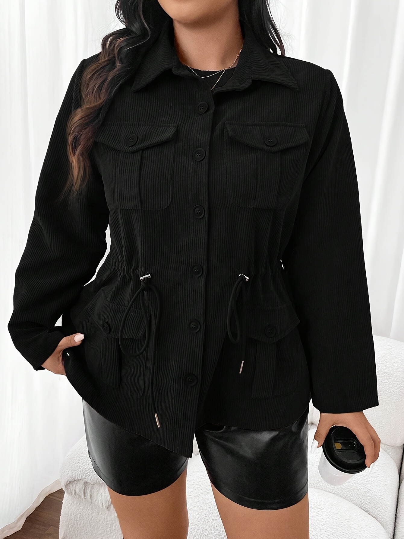 Plus Size, French Elegant Drawstring Waist Women's Plus Size Jacket with Turn- Collar Long Sleeve Pocket Casual Solid Color Blazer
