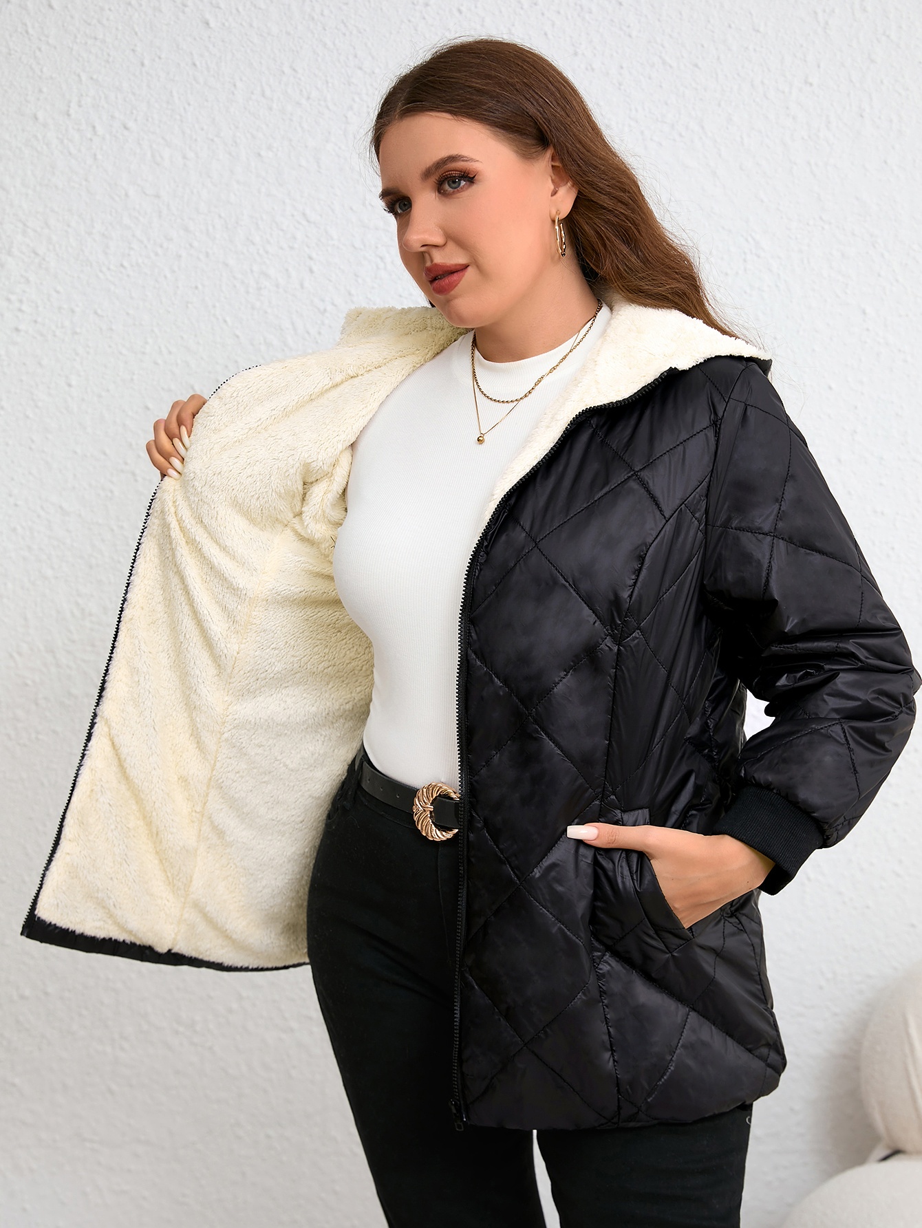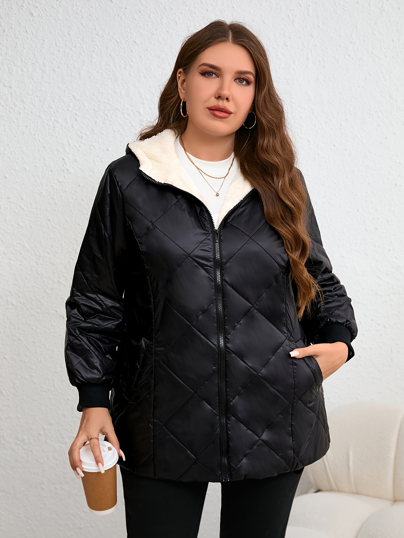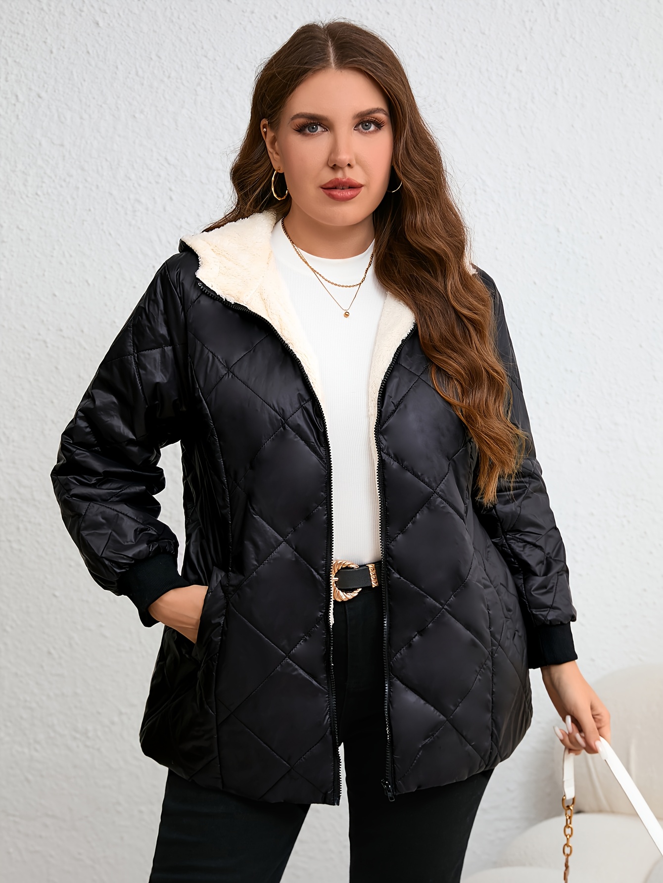 Plus Size, Plus Size Women's Elegant Winter Hooded Coat - Thickened Warm Long Sleeve Black Jacket with White Lining, Machine Washable Regular Fit for Casual & Formal Outfits