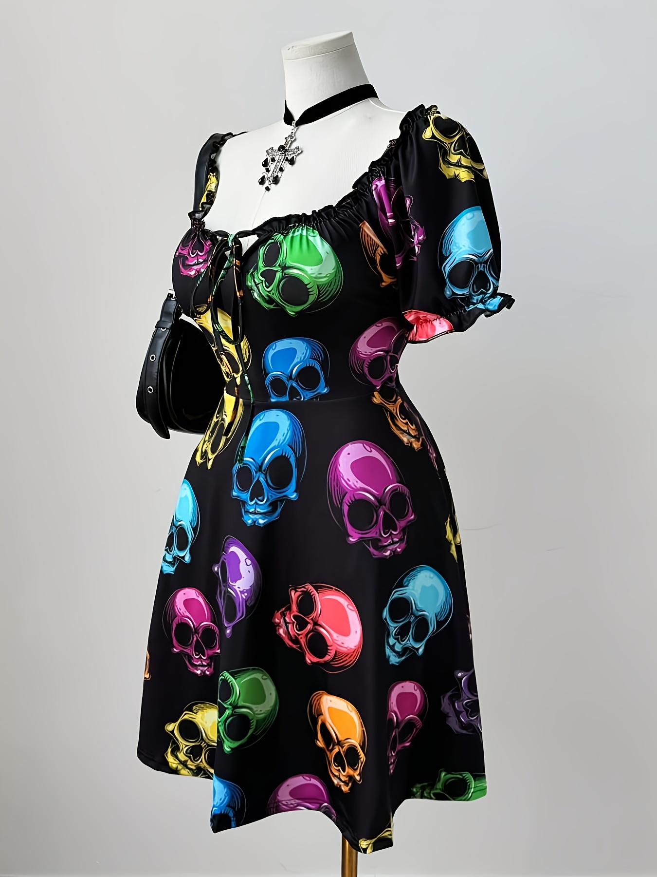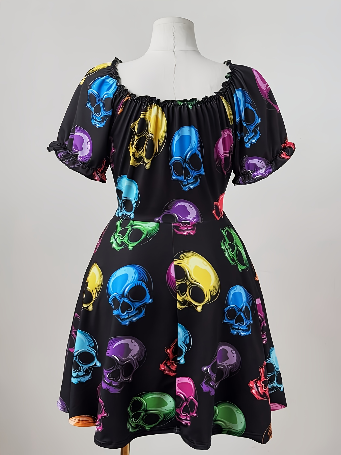 Plus Size - Plus Size, Women'S Plus Size Halloween Party Dress - Gothic Skull Print in Black, Blue, Green, Pink, Orange, Purple - Flared Hem Formal & Costume Party Outfit - Elegant Halloween Party Attire for Women, Festive Wear, Round Neckline