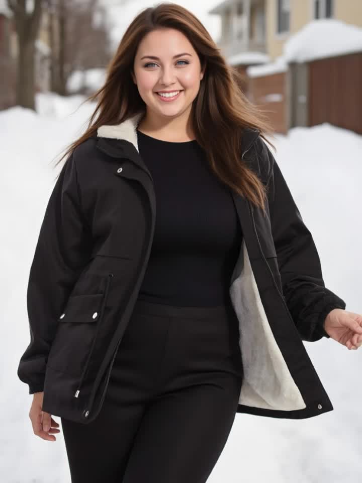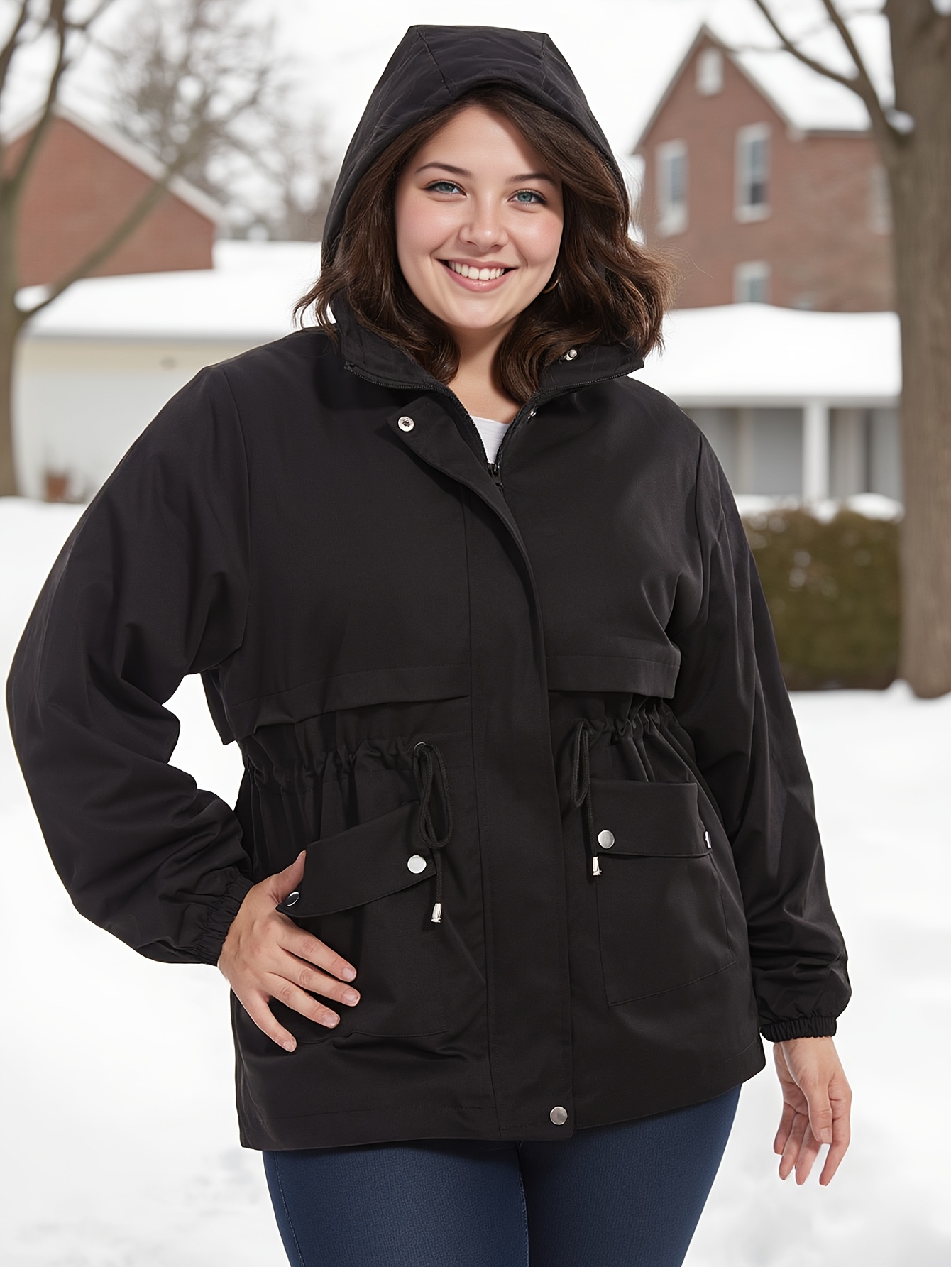 Plus Size - Plus Size Women'S Winter Parka with Drawstring Waist & Hood - Warm Polar Fleece Lined Coat, Casual Black Bomber Jacket for Cold Weather, Winter Parka, Snowy Day Attire, Flared Hem Coat, Nonstretch Fabric
