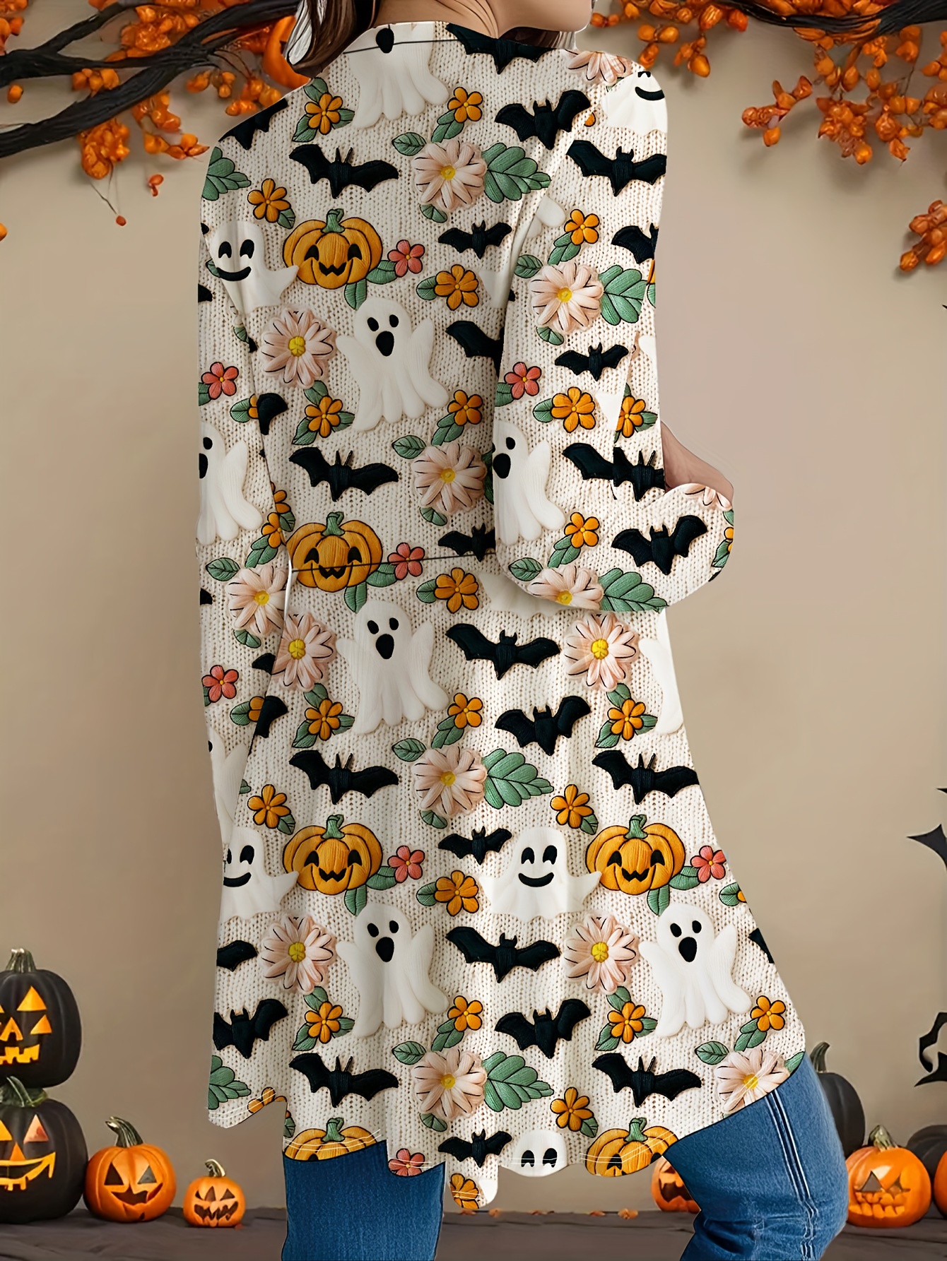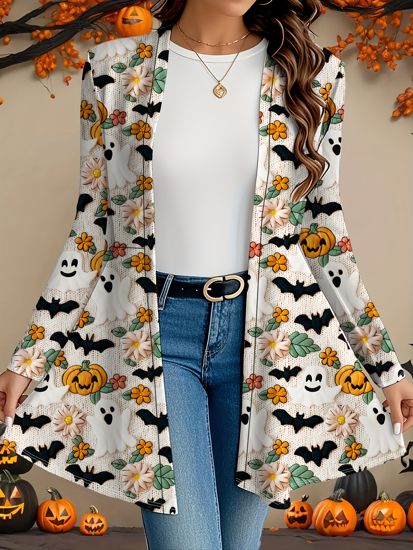 Plus Size, Women's Plus Size Halloween Pumpkin Bat Flower Print Long Sleeve Jacket Cardigan Coat