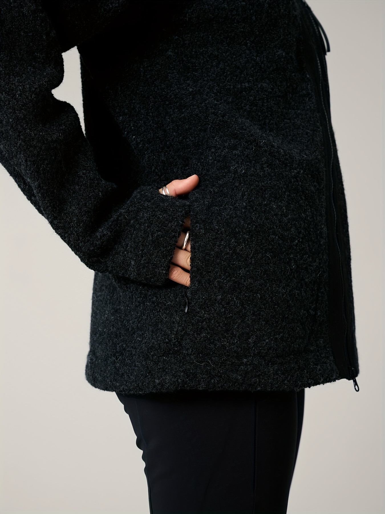 Winter Black  High Collar Jacket - Outdoor Casual, Front Zipper, Hidden Zipper Insert Bag