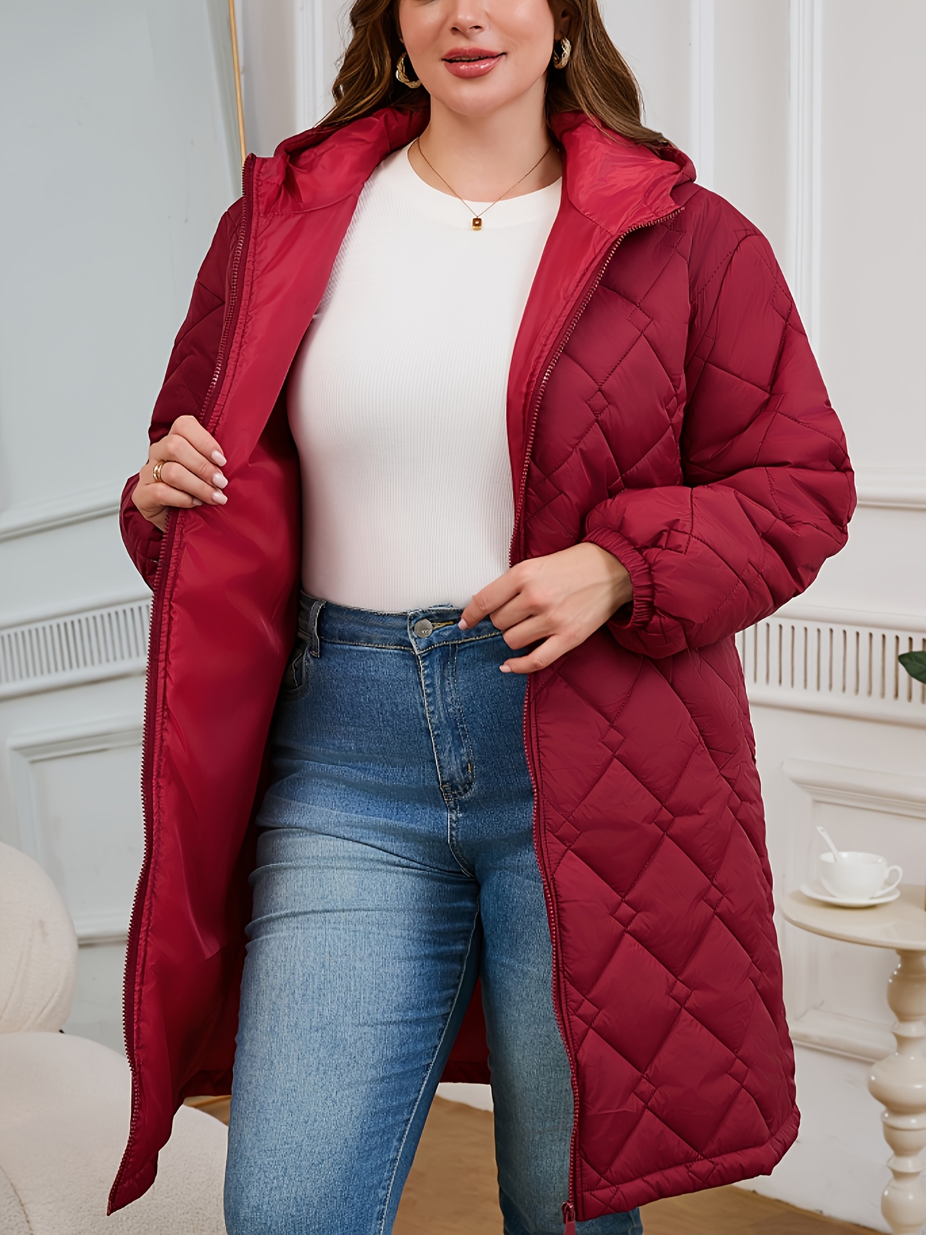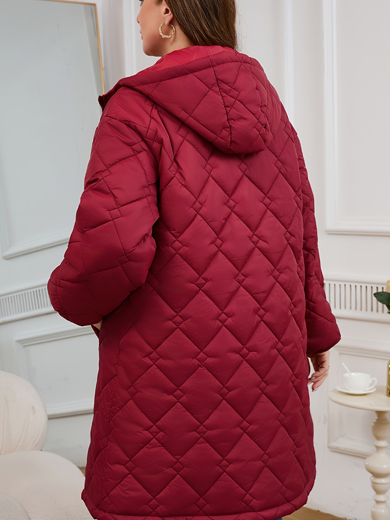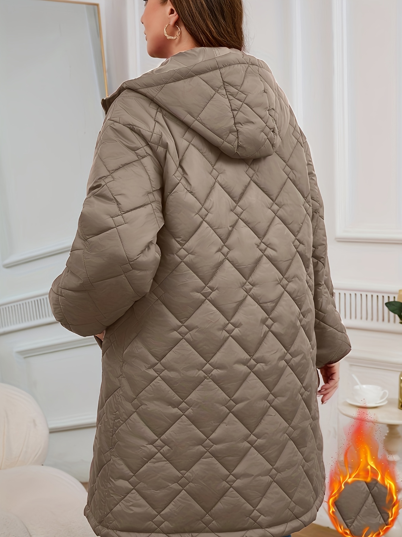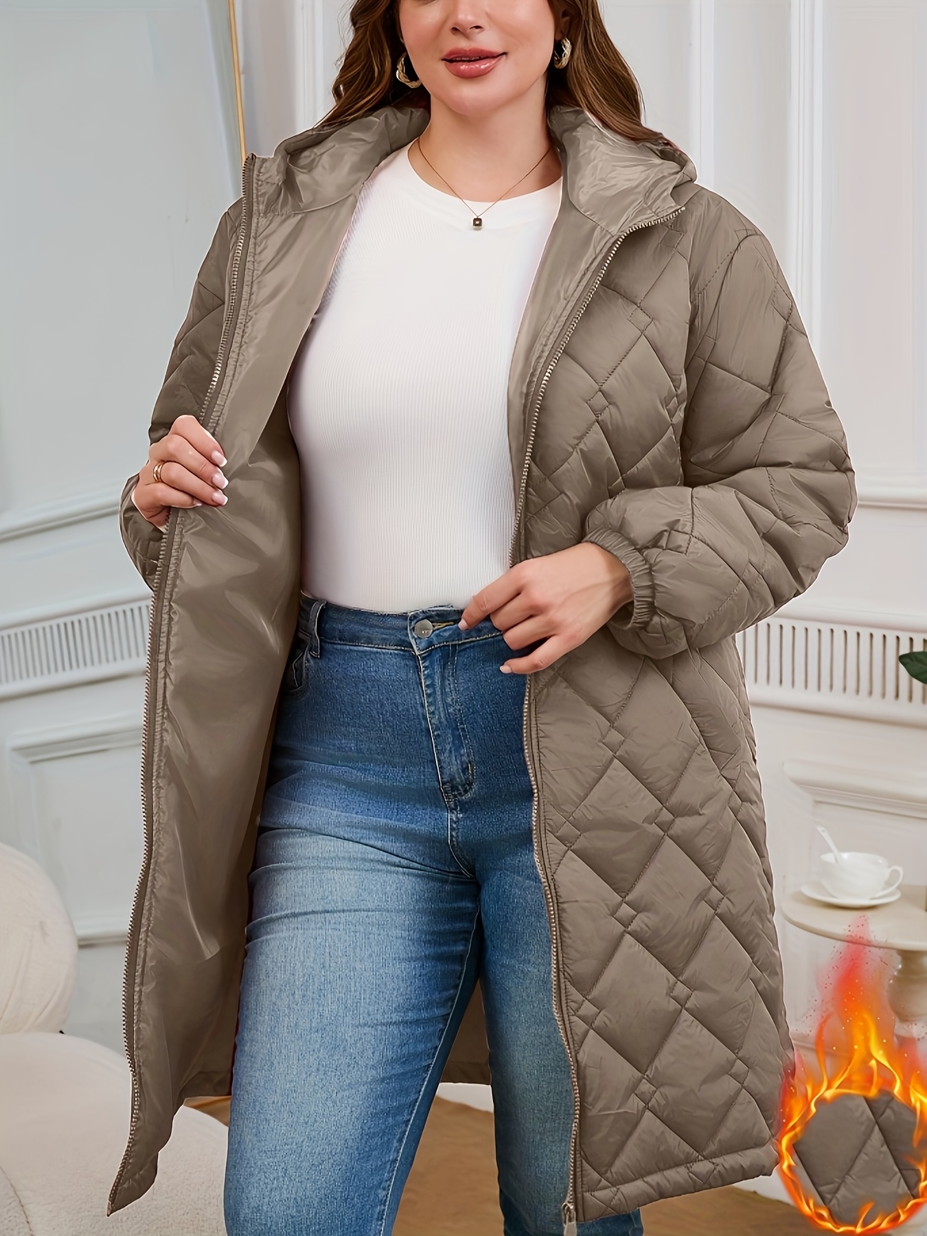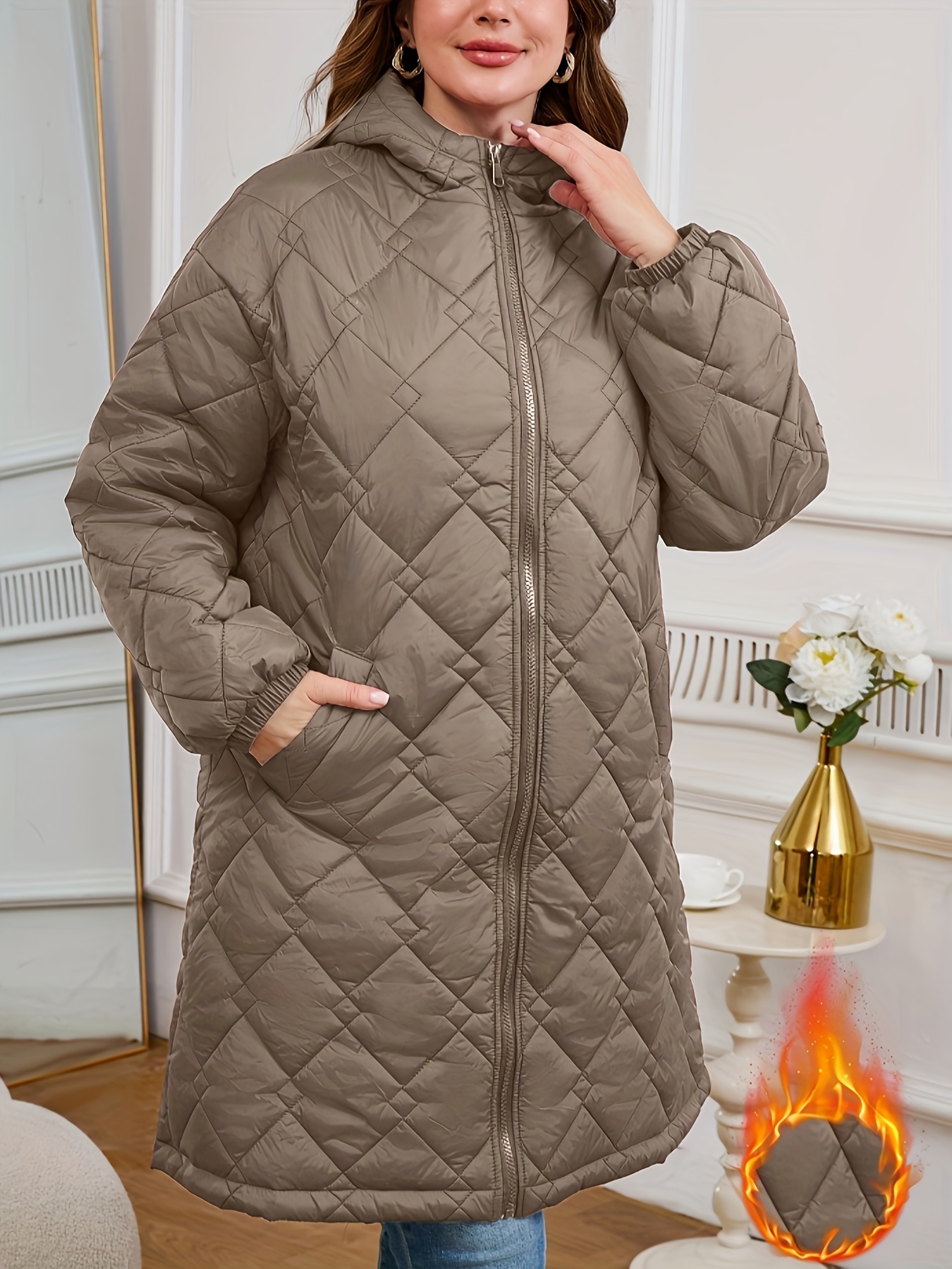 Women's Elegant Quilted Hooded Jacket with Zipper Closure - Large Square Pattern, Machine Washable, All-Season Versatile Outerwear for Casual & Formal Wear, Formal Coat, Easy Maintenance Coat