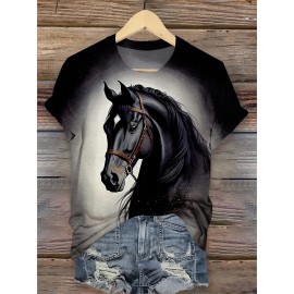[95% Polyester T-Shirt] Polyester 95% Spandex 5% Women's Summer Casual Crew Neck T-Shirt | Animal Horse Print Short Sleeve Top, All Season Fashion, 175g/m² Lightweight - Perfect Gift for Mom