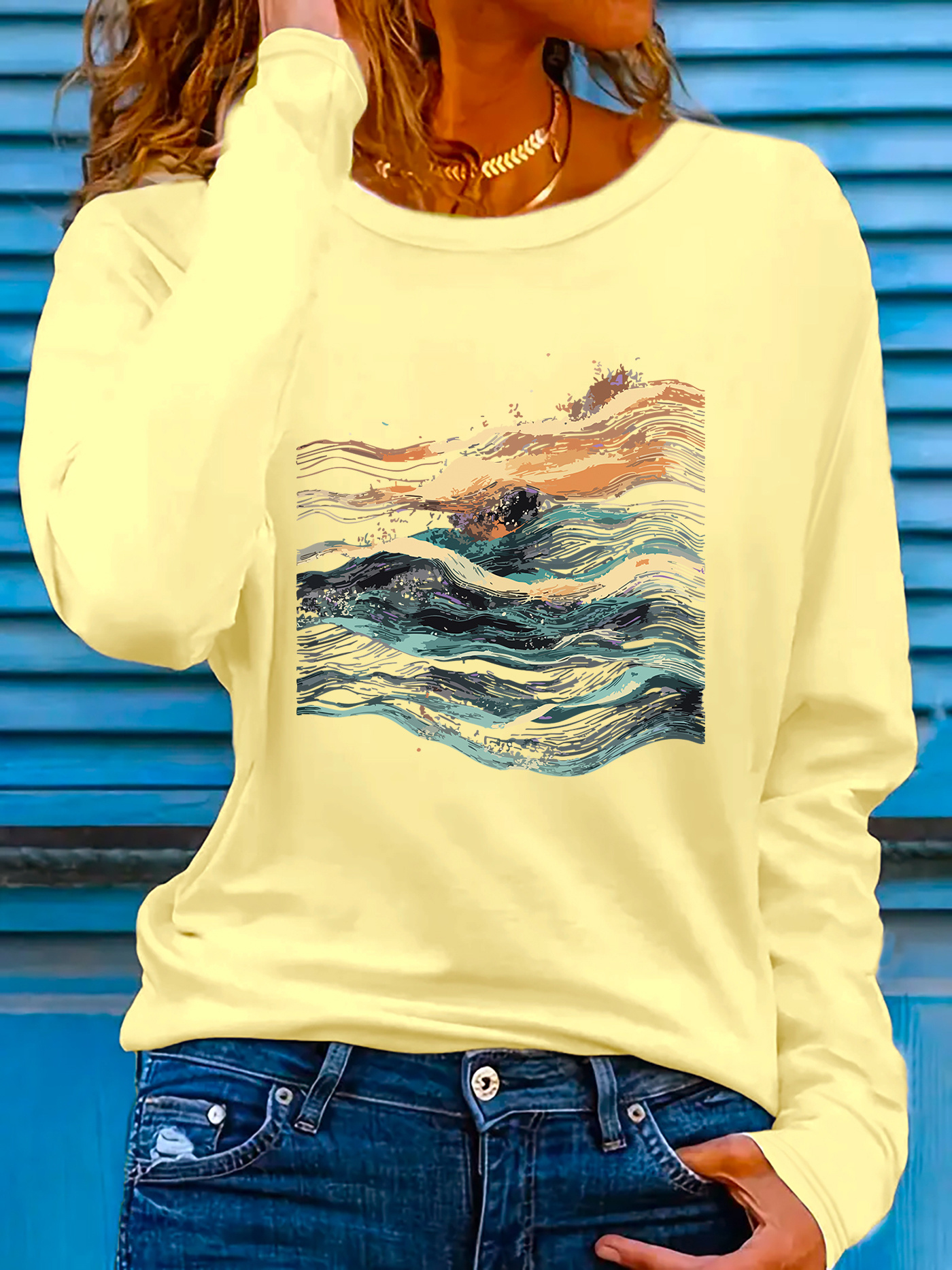 Women's West Coast Surf Gradient Tie-Dye Long Sleeve T-Shirt, Bright Yellow Crew Neck with Artistic Ocean Wave Print, Stretchy Polyester Blend, Casual Spring/Summer Sportswear, Machine Washable, Beach Wear