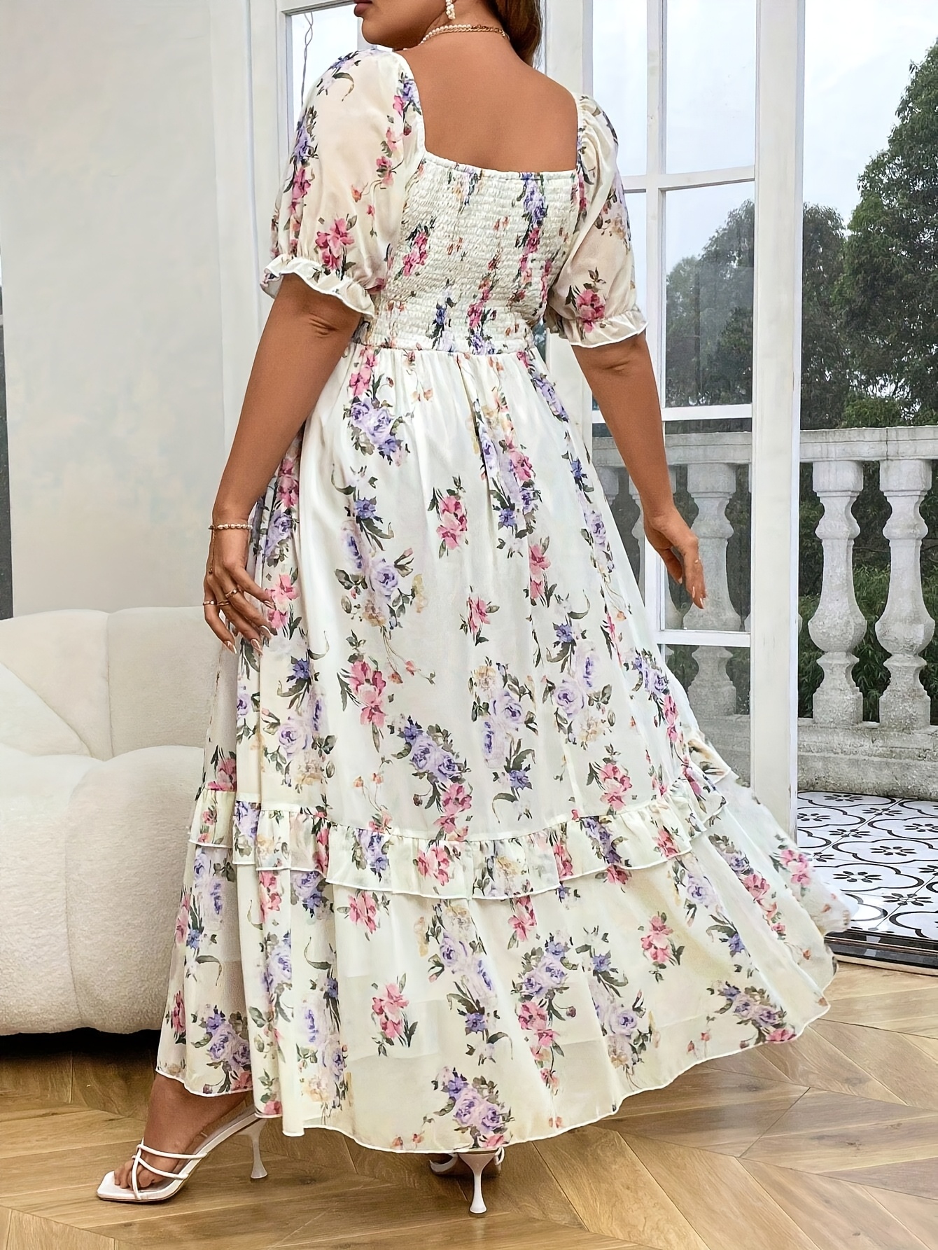 [Floral Print Dress] Plus Size Elegant Floral Print Midi Dress with Puff Sleeves and Ruched Waist - White with Pink and Purple Flowers, Perfect for Casual Outings