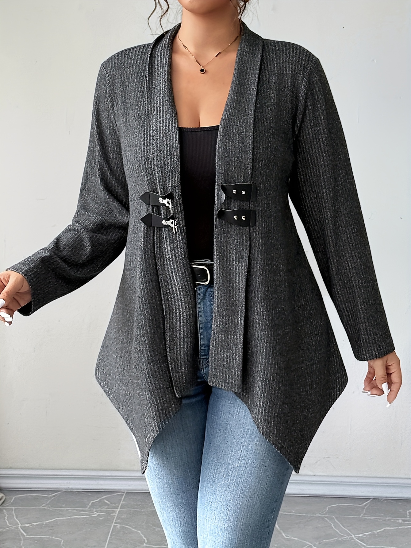 [Plus Size Cardigan] Plus Size - Women's Elegant Casual Cardigan - Long Sleeve, Asymmetrical Hem, Button- Front, Button Closure, Medium Stretch, Solid Color, Perfect for Fall/Winter, Casual Wear Cardigan | Asymmetrical Hemline | Button Closure Coat
