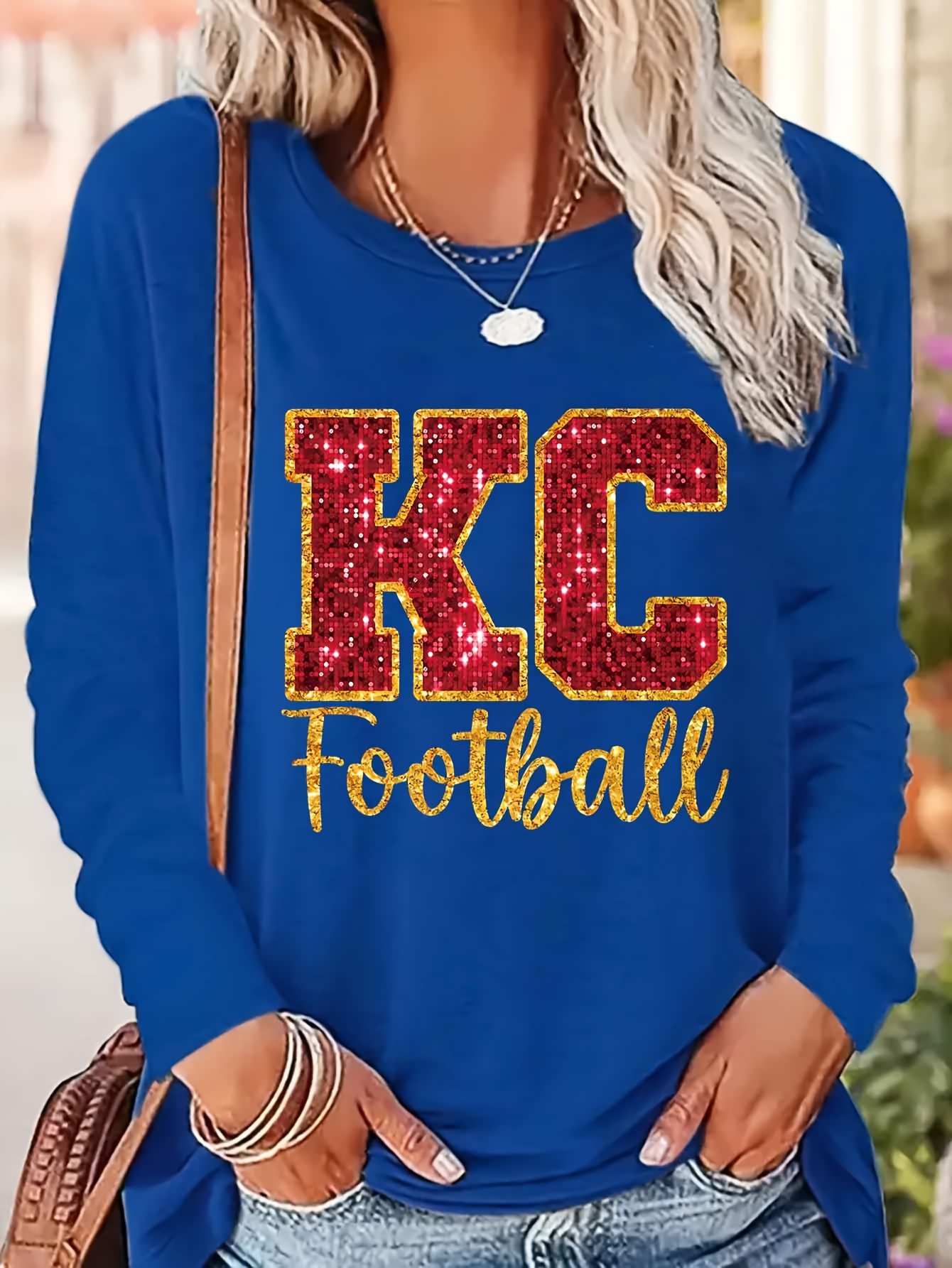 KC Football Long Sleeve Crew Neck T-Shirt - Casual, Alphabet Pattern, Regular Fit, Polyester Knit Fabric, All Seasons, No Belt, Long Sleeve, Regular Sleeve, No Chest Pad, Pullovers, Fabric Weight 180 g/m²
